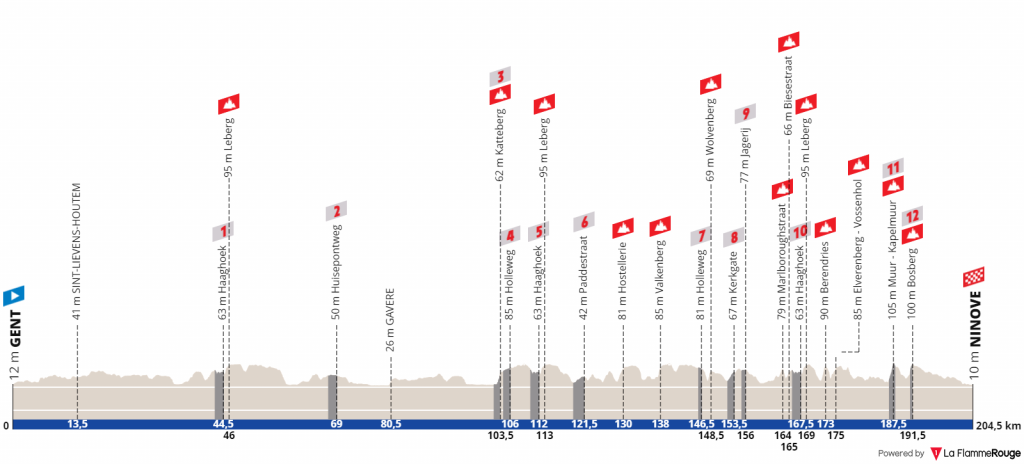 Do lado masculino, o primeiro setor de pavê surge ao km 43, o Haaghoek, sendo que o último está reservado para o km 190, a 14.5km do fim. A maior dificuldade do dia está reservada para a penúltima subida em empedrado, o já famosíssimo Muur – Kapelmuur. Porém, a corrida deverá já estar partida antes disso, devido às diversas colinas e setores de pavê, que surgirão de forma consecutiva, serem bastante propícios a ataques. A partir do km 145 o espetáculo irá aparecer pois os favoritos devem estar na decisão e os ataques irão começar.