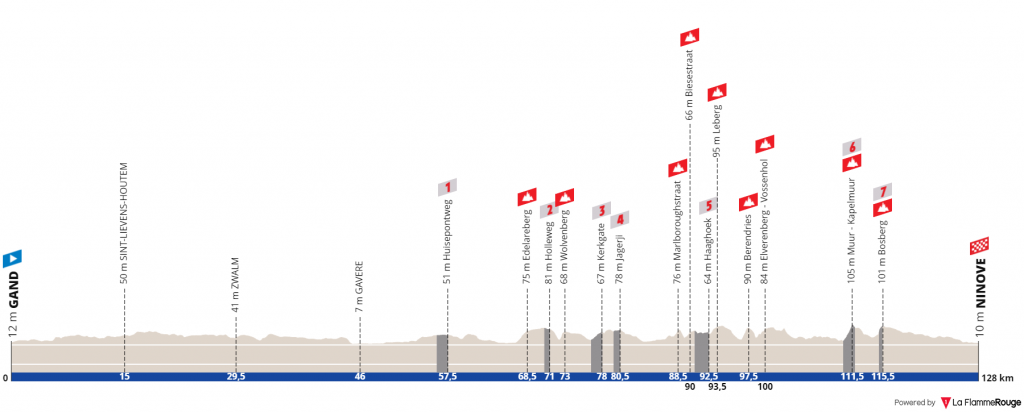 Do lado feminino, a prova terá 128km e sensivelmente metade dos setores de pavê e colinas do lado masculino. O primeiro setor de pavê irá aparecer ao km 56 e a corrida poderá decidir-se pouco depois com os diversos ataques esperados das principais candidatas. Tal como no lado masculino, a maior dificuldade do dia é o Muur – Kapelmuur e o seu alto situa-se a 16.5km do fim.