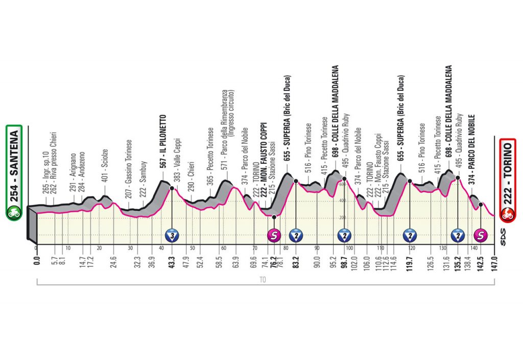 A entrada no duro circuito final vai marcar o ponto decisivo da jornada, com o pelotão a chegar muito rapidamente à segunda categoria de Superga, que também marca o final da Milano – Torino, e que apresenta 5km a 8.6% de pendente média e rampas máximas de 14%, A descida será muito curta, com uma pequena fase de planalto a suceder e novamente o pelotão estará às portas de outra segunda categoria, o Colle della Maddalena, com 3.5km a 8.1% de pendente média e rampas máximas de 20% no final do primeiro km de subida. Depois disso, a descida para a meta terá mais de 10km, interrompida apenas por uma pequena rampa onde na volta final se situará o sprint intermédio bonificado, a 4.5km do fim. Os ataques poderão e deverão surgir em força, e quem ganhar vantagem na descida irá ficar cara a cara com a vitória na etapa.