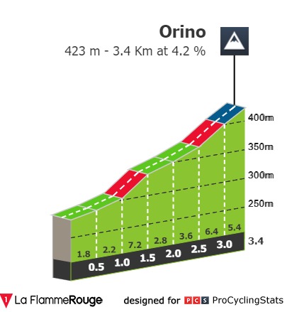 O ritmo deverá depois acalmar um pouco, com o pelotão a entrar numa fase maioritariamente de descida e de plano, até chegar ao km 71.5, onde se cruzará pela primeira vez a linha da chegada. As ciclistas darão depois 4 voltas ao circuito final de 17.75km em que se incluirão duas ascensões, a primeira ao Casalzuigno, uma pequena rampa de 700m a 7.2% de pendente média, que apesar de não categorizada, poderá também ver diversos ataques acontecerem, e a segunda a Orino, uma colina de 3.4km a 4.2% de pendente média, em que a fase final se apresenta claramente como decisiva, já que após 500m a 7.2% na entrada do segundo km de subida, a pendente no km inicial, e no km intermédio não passa dos 3.5%. Os 900m finais de Orino farão certamente a maior seleção e será aí que as principais candidatas deverão jogar as suas cartas.