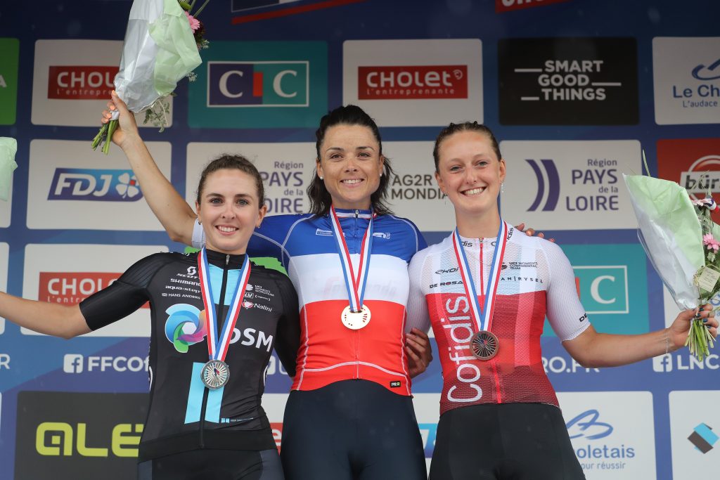 Pódio do CRI Francês com Juliette Labous – Audrey Cordon-Ragot e Cedrine Kerbaol (da esquerda para a direita)