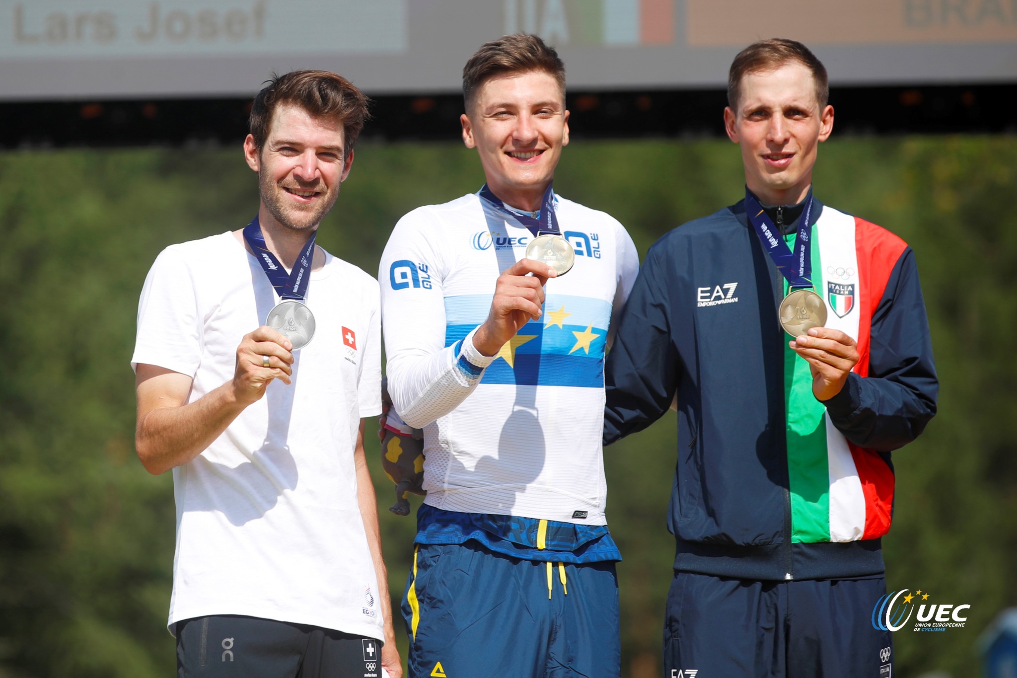 O pódio Elite Masculino com Lars Forster – Vlad Dascalu – Luca Braidot (da esquerda para a direita)
