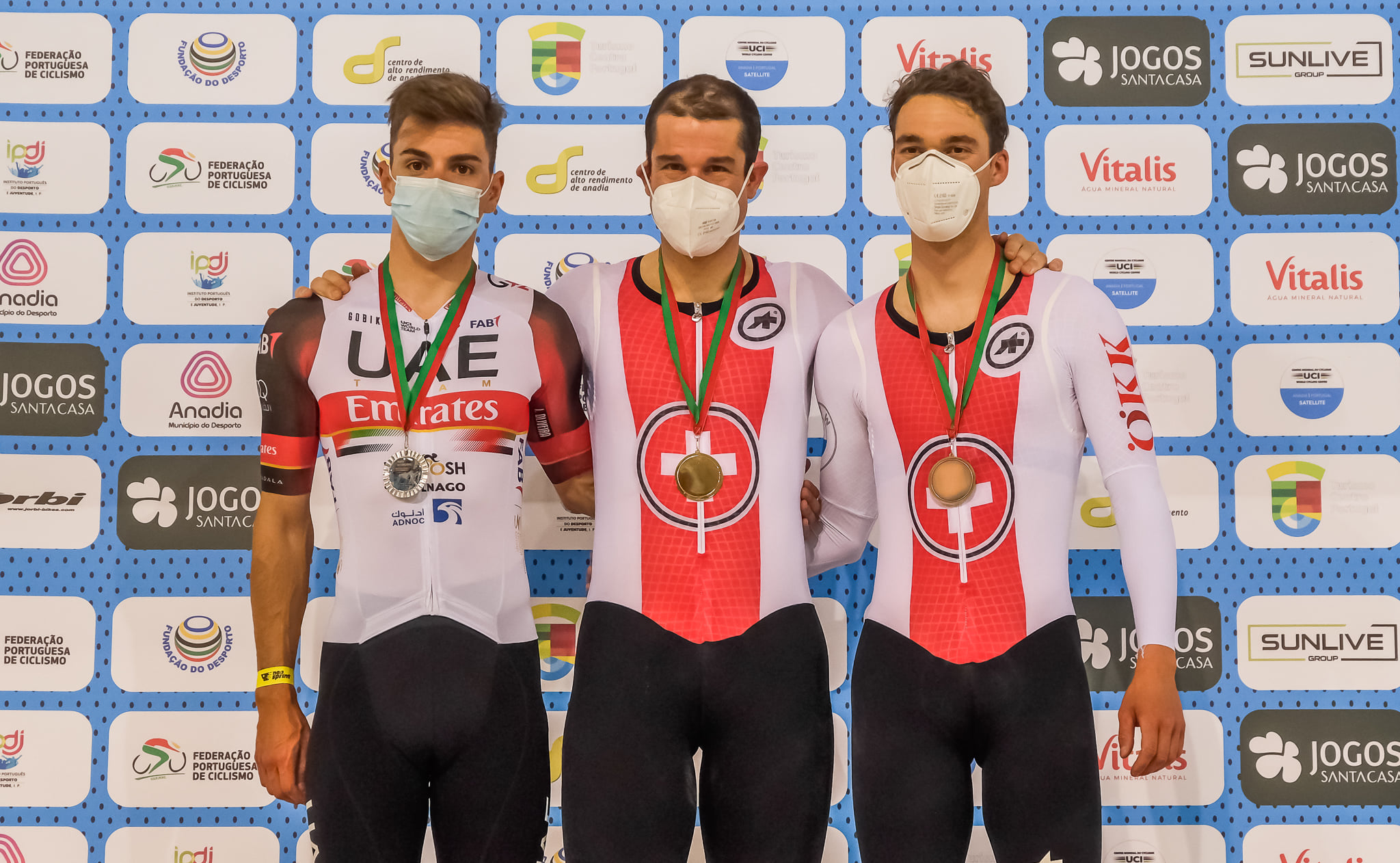 Pódio da Corrida por Pontos masculina com Simon Vitzthum – Thomas Boudat – Yoeri Havik (da esquerda para a direita)