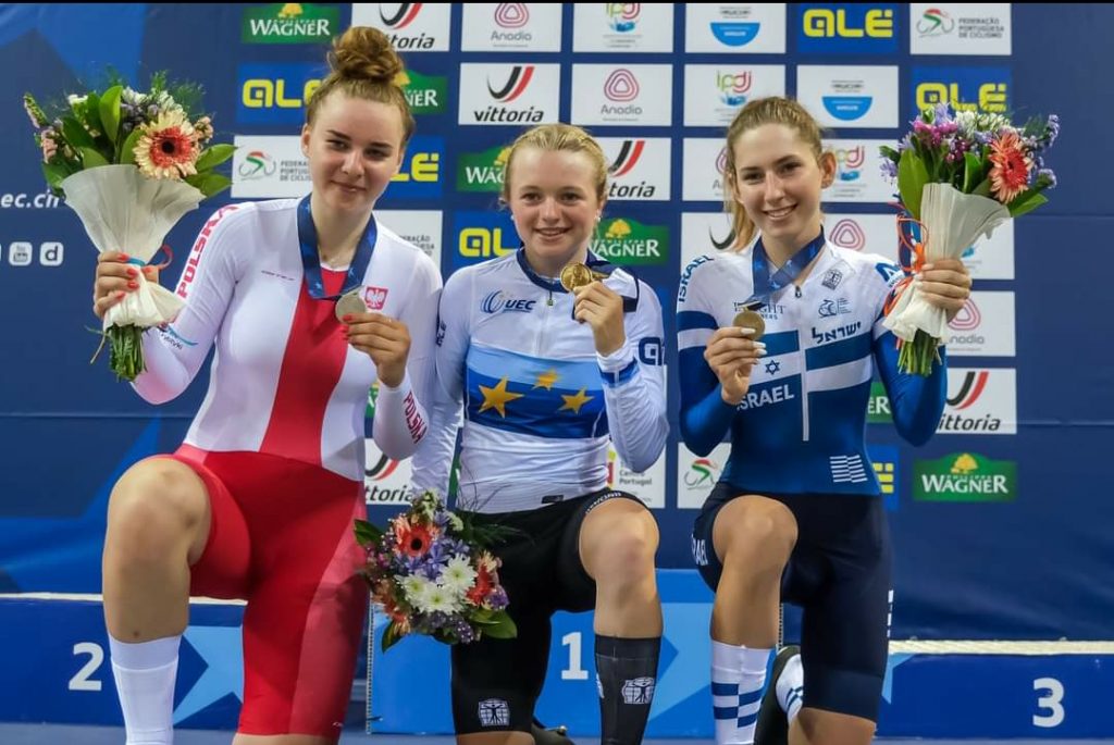 Podio Scratch Júnior Feminino com Maja Tracka – Lani Wittevrongel – Ori Bash (da esquerda para a direita)