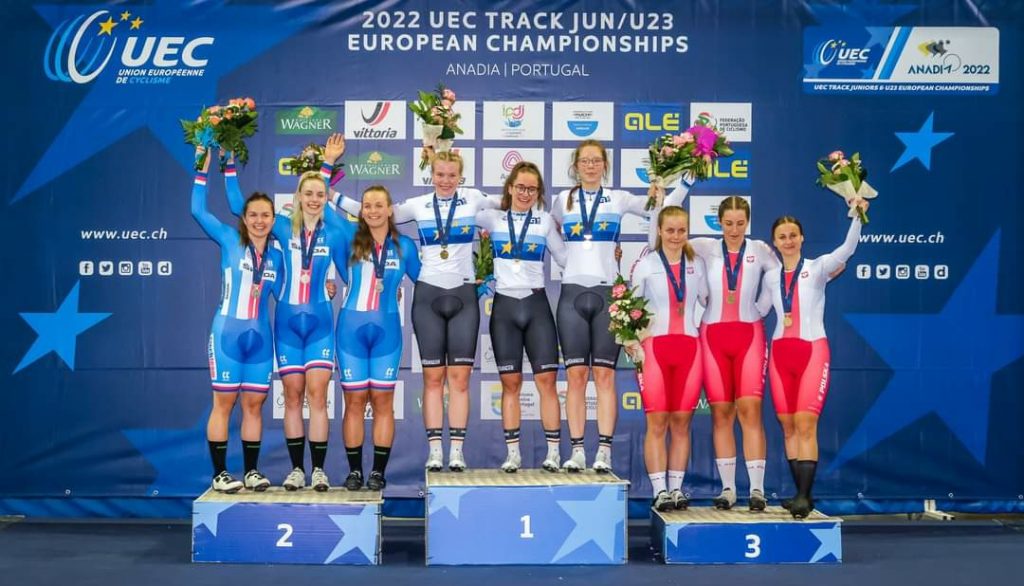 Podio Sprint Coletivo Júnior Feminino com Chequia – Alemanha – Polónia (da esquerda para a direita)