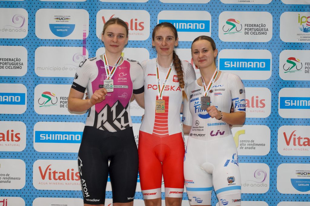 Pódio final do Scratch das Elites Femininas com Maja Tracka, Nikol Plosaj e Eliza Rabazynska.